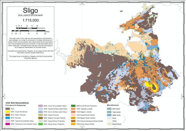Further west, towards Enniscrone, blanket peat and podzols are prevalent in mountainous areas. Podzols are typical in wet mountainous conditions and while generally non-productive for intensive agriculture, they are important for recreation, forestry and stock-rearing. The acid nature of these soils would require liming and fertilisation to improve nutrient status for agriculture.