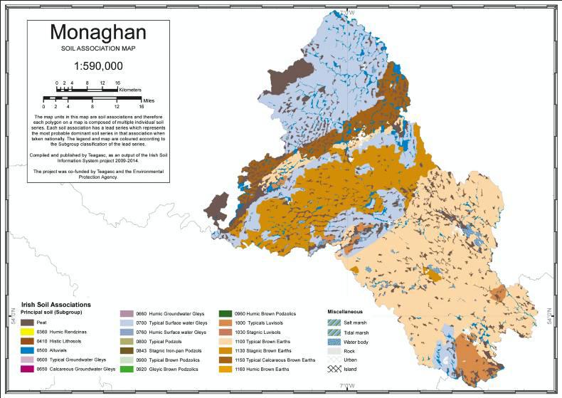 Over half of Co Monaghan is characterised by drumlin areas and these are found associated with wet soils such as surface-water gleys (slowly permeable sub-surface layer). Basin peat is a common feature found in the hollows between drumlins. These features are typical of the area stretching from the north of the county to Ballybay. An exception to this is the tract running east to west, from Clones through Monaghan town to the east coast, where lowlands formed from limestone glacial till can be found, predominantly associated with luvisols (movement of clay down the soil profile).
