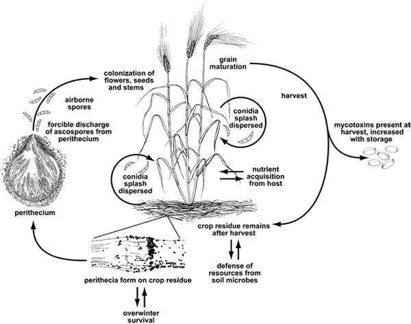 The initial point of a FHB epidemic cycle is an inoculum source, (eg crop debris, alternative hosts, Fusarium seedling blight and footrot of cereals) where Fusarium spp either survive as saprophytic mycelium or as chlamydospores (thick-walled asexual spores capable of surviving adverse conditions).