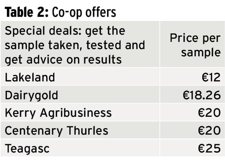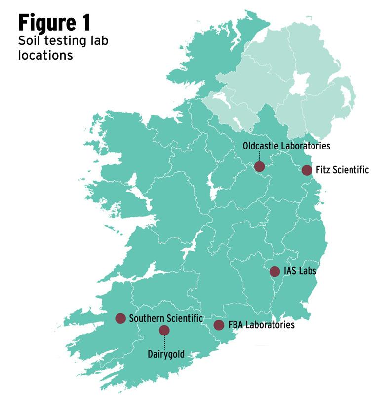 Table 1 outlines the main sampling labs in Ireland and what they charge for testing soil samples.