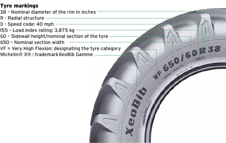 Under the latest tyre marking structure, all of the measurements are metric except for the rim diameter. The marking figures below are taken from a Michelin tyre from XeoBib range. The tyre size, speed, and load index are common among all tyre manufacturers. Other markings on the tyre are related to the brand name and model of tyre.