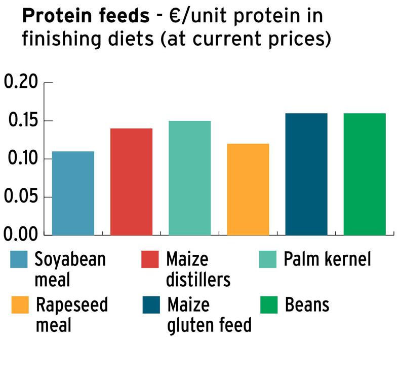 With soya bean meal likely to trade close to €370 for the coming months, few other ingredients touch it in terms of value. While it’s the most expensive ingredient on the page, the concentration and quality of its protein means that when buying animal performance, it’s relatively cost-efficient at present. While palm kernel seems cheap, the reality is that it is not very palatable and will affect performance at high inclusion rates (see Table 2). However, it is a good source of fibre and is included in many types of ration.
