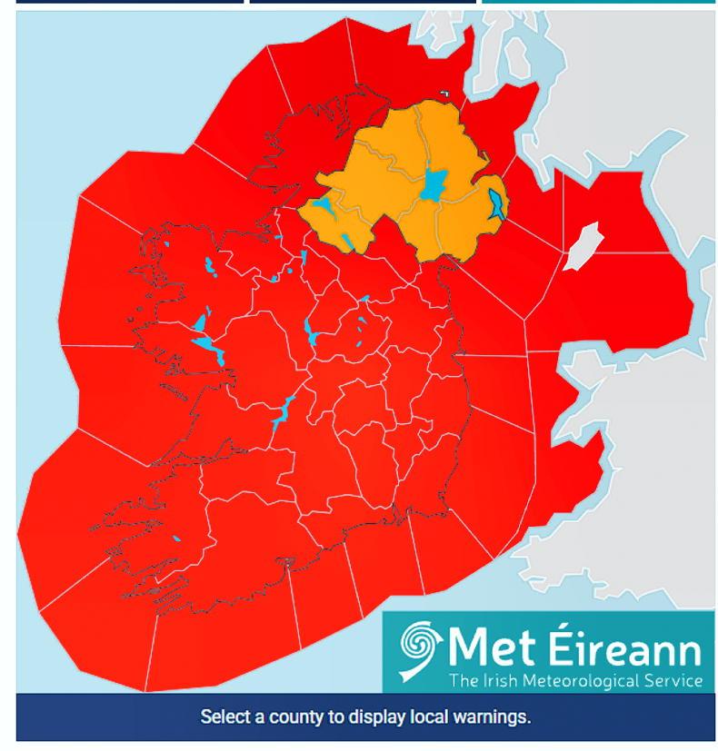 Yellow warning: The concept behind yellow level weather alerts is to notify those who are at risk because of their location and/or activity, and to allow them to take preventative action. It is implicit that yellow level weather alerts are for weather conditions that do not pose an immediate threat to the general population, but only to those exposed to risk by nature of their location and/or activity. Orange warning: This category of orange level weather warnings is for weather conditions which have the capacity to impact significantly on people in the affected areas. The issuing of an orange level weather warning implies that all recipients in the affected areas should prepare themselves in an appropriate way for the anticipated conditions.Red warning: The issue of red level severe weather warnings should be a comparatively rare event and implies that recipients take action to protect themselves and/or their properties; this could be by moving their families out of the danger zone temporarily, by staying indoors or by other specific actions aimed at mitigating the effects of the weather conditions.Careful self-assessment of weather conditions needs to take place as well, as these can rapidly deteriorate, and red warnings can extend out into neighbouring counties which were previously in an orange warning zone.