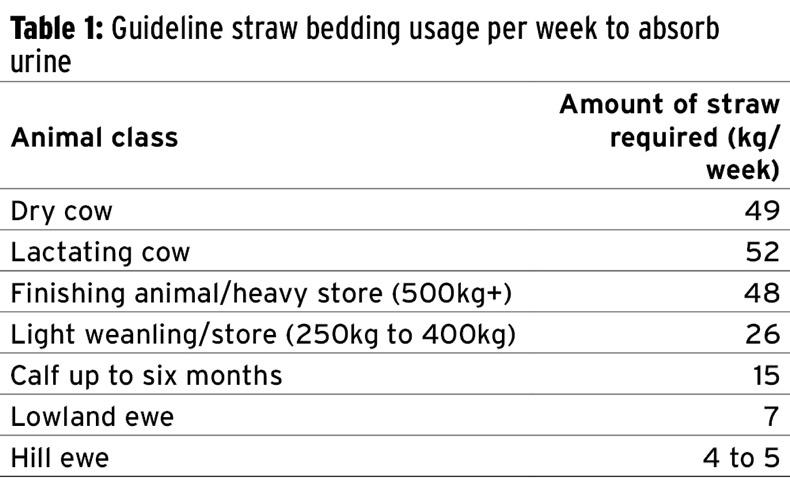 Where animals will be housed on straw for a large part of the winter, it is useful to carry out a budget to see if sufficient straw is available. Table 1 details guideline volumes required to absorb all urine. This can vary depending on the type of diet fed, with high-fibre diets requiring less straw bedding. Take note also that the weight of bales can vary greatly depending on how well they are packed, with a higher moisture content in some bales also likely to add weight to bales saved in difficult weather in recent weeks.