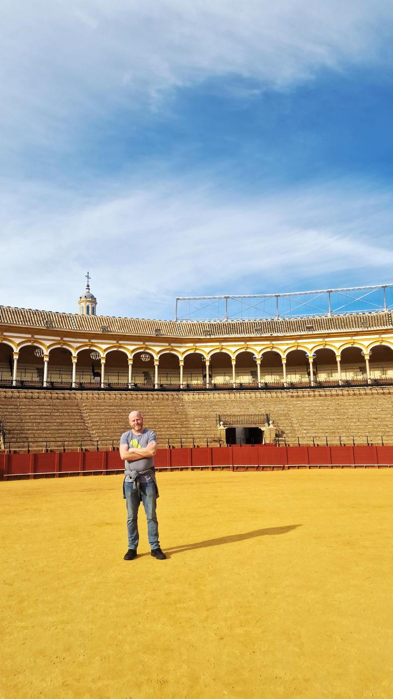 Janine's husband, Pat, is in his matador element in the bull ring at the Plaza de Toro. \ Janine Kennedy