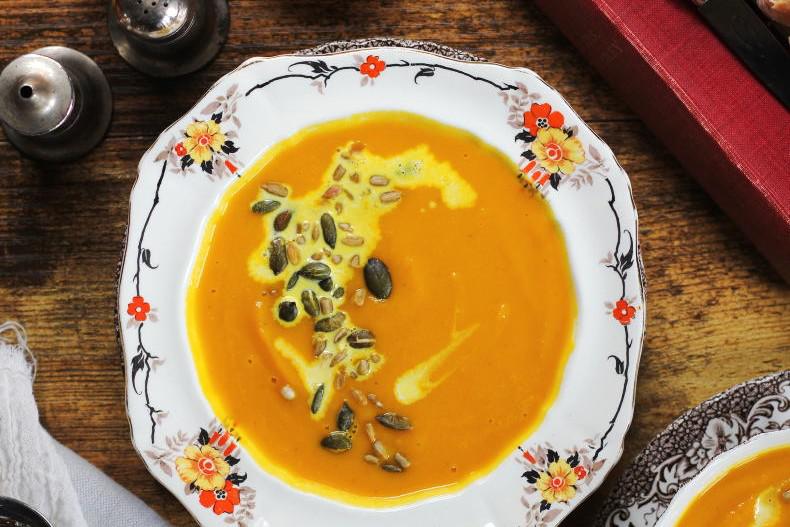 6 Pour the soup into serving bowls and garnish with a little drizzle of cream and a sprinkling of the toasted seeds.