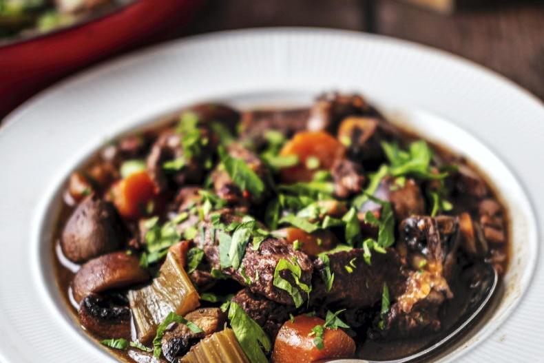 When the beef bourguignon is ready, season to taste and serve straight to the table with a separate bowl of crusty French bread.