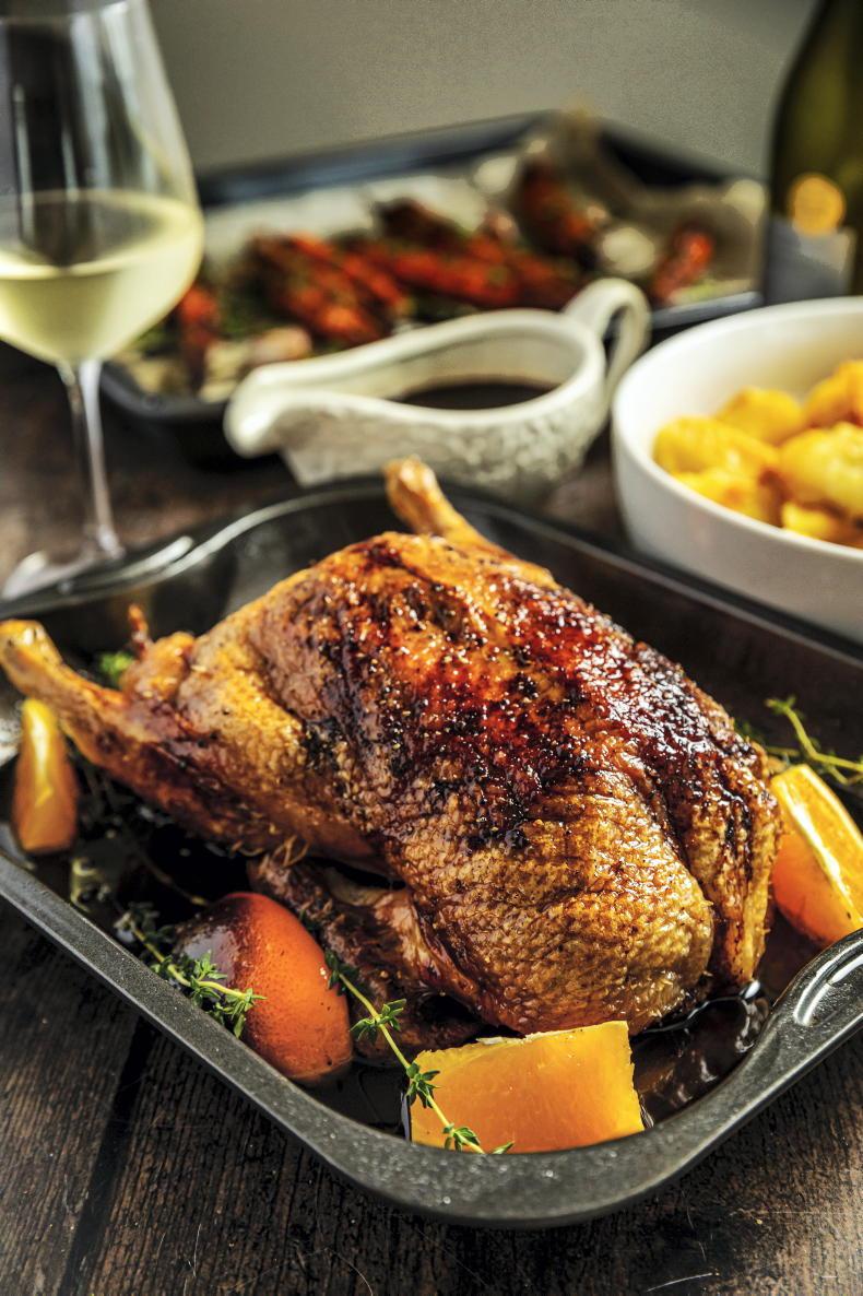 7 The duck needs to cook for 2¼ hours in total or until it’s golden brown and tender and the drumsticks feel nice and loose.