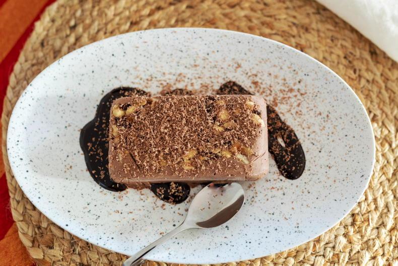 The chocolate and hazelnut semi-freddo is a cross between a frozen chocolate mousse and an ice cream. It is a nice, light Italian dessert. ?This dessert can be made even a few days ahead but do take out of the freezer 10 minutes before serving.
