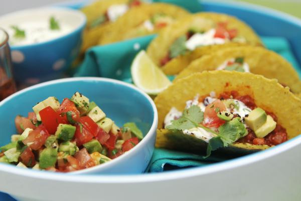 4 To serve, place some of the mixed bean chilli into each taco shell and spoon the tomato and avocado salsa on top. Add a dollop of sour cream to each one to serve.
