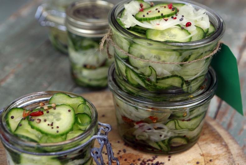 • 3 Pack the cucumber and onions into four 450ml (¾ pint) warm, sterilised Kilner jars, layering them up with the herbs and spices to within 1cm (½in) from the top of the jars. Ladle in enough of the vinegar and sugar liquid to cover completely. Seal and store in a cool, dark place for up to three months, or until needed. Once opened, keep in the fridge and use as required.