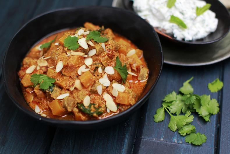 1 Heat the oil in a large pan over a medium heat and cook the onion for two to three minutes, then add the garlic, ginger and turmeric, if using, and cook for another minute or so. 2 Stir in the harissa paste to taste and then add the yoghurt a large spoonful at a time, stirring continuously. Add the tomatoes and stir in the butternut squash. 3 Fold in the lamb, then cover with a lid and cook gently for 25-30 minutes until the lamb and butternut squash are tender. 4 Stir in the spinach leaves and allow to just warm through. Garnish with the flaked almonds and coriander sprigs and serve with the wraps and tzatziki.