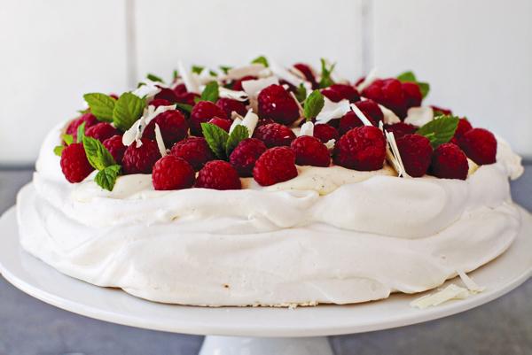 Raspberry & white chocolate pavlova with lemon and mint