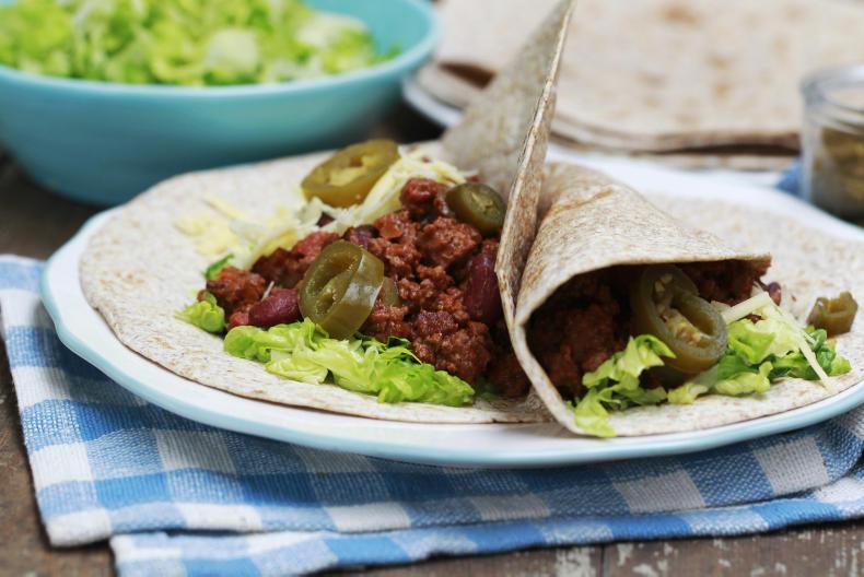 3 Heat a large non-stick frying pan and heat each wrap for about 10 seconds on each side. Arrange the lettuce down the middle of each wrap and then spoon over the sloppy joe mixture.