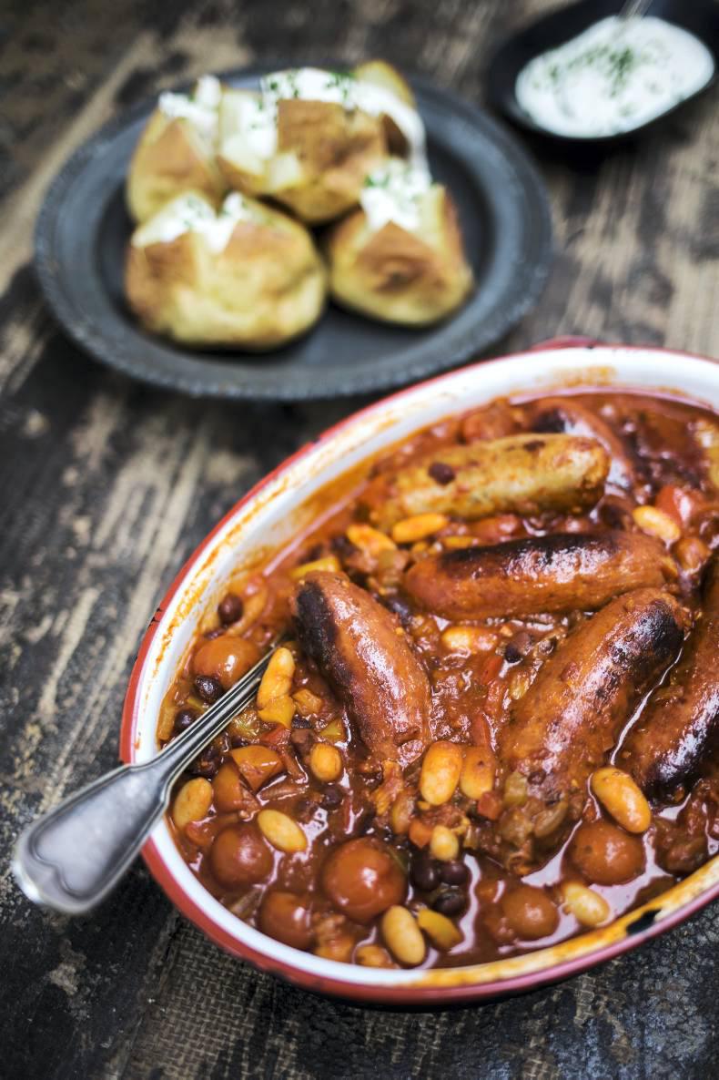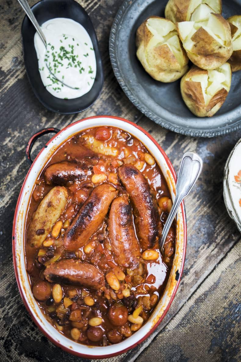4 Stir the beans into the sausage mixture and simmer for another five minutes or so, until heated through. Season to taste and ladle into wide-rimmed bowls. Add a jacket potato and a dollop of sour cream with chives to serve.