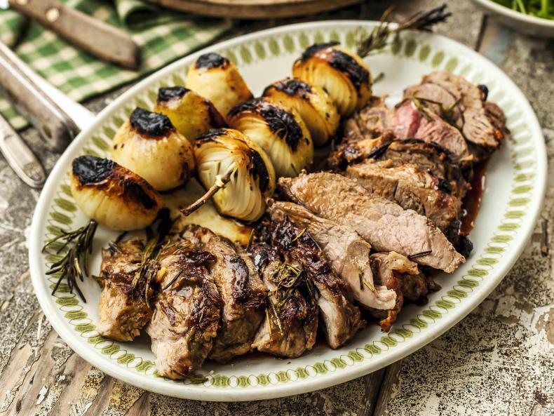 Butterfly leg of lamb with caramelised onion skewers