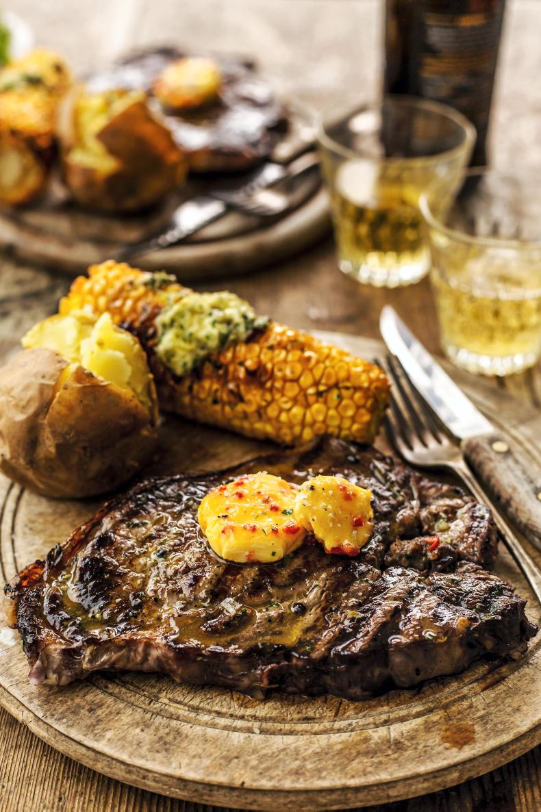 1 Pour half the bottle of wine into a non-metallic dish. Cut the garlic bulb in half across the equator and add to the wine.2 Coarsely crush the peppercorns in a pestle and mortar and add with the rosemary and thyme sprigs. Add the steaks, turning to coat and set aside to marinade for at least half an hour and anything up to 24 hours for a more intense flavour.3 Lift the steaks out of the marinade and shake off any excess. Cook over medium coals for 2-3 minutes for rare, 3-4 minutes for medium and 5-6 minutes for well done, turning occasionally. Cut the flavoured butter of your choice into four equal pieces and arrange a piece on each steak on warm plates. Add a mixed green salad and jacket potato to each one if liked.Chargrilled sweetcorn