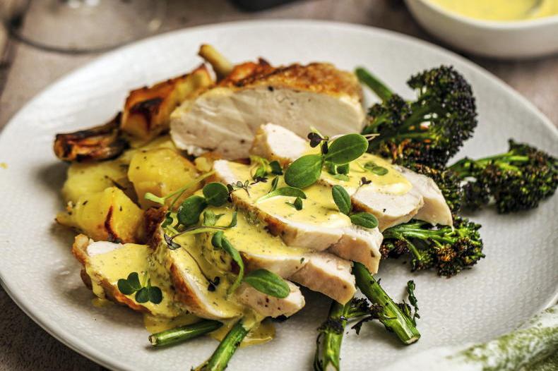 This roast chicken has a French twist with the homemade aïoli. The chicken supreme is a skin-on breast on the bone with the first wing tip still attached. The marinade moistens and adds delicious flavour. It is a very easy marinade to make. I like it with tarragon, but leave that out if you wish. Adding the juices from the pan stirred in at the last minute really lifts it.