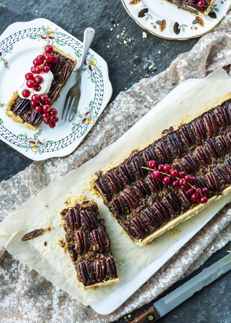 1 First make the pastry: put the flour in a food processor with the butter and blitz until it looks like fine breadcrumbs. Add the egg yolks and salt and blitz again until it forms a ball. If the mixture still looks a bit dry then you can add the water, but you want a soft pastry that is not sticky. Tip onto a lightly floured surface and shape into a ball. Wrap in clingfilm and chill for 15 minutes to rest. 2 Preheat the oven to 180°C (350°F, gas mark four). Roll out the pastry on a lightly floured surface and use it to line a 10cm (4in) x 34cm (14in) loose-bottomed flan tin that is 2.5cm (1in) deep. Put back in the fridge for 15 minutes to rest. 3 Meanwhile, put the pecans on a baking sheet and bake for 8-10 minutes until lightly toasted. Remove from the oven and set aside 100g of perfect whole ones, then roughly chop the remaining 75g to use in the filling.4 Fill the lined pastry case with parchment paper and baking beans or dried kidney beans and place on a baking sheet. Bake for 15 minutes until the pastry looks set but not coloured. Remove the beans and parchment. Break one of the eggs (put the yolk to one side) and quickly brush the base with the unbeaten egg white to form a seal. Put back in to the oven for another five minutes until the base is firm and the pastry feels sandy to the touch. 5 To make the filling, put the butter, sugar, golden syrup, maple syrup and salt in a pan over a medium to high heat. Just bring it to the boil and then turn down the heat and let it simmer for three to five minutes over a very low heat. Take off the heat and stir in the whiskey and vanilla and then leave it to cool a little.6 Add the eggs and reserved egg yolk one at a time, whisking well between each addition and then fold in the chopped pecans. Pour into the pastry case and then arrange the whole pecan nuts in three attractive rows – you’ll find you have about 18 in each one. Place the tart into the oven on a baking sheet and bake for 15-20 minutes or until the mixture is set but still a little wobble to it. Leave to cool slightly, then cut into slices and serve warm on plates.
