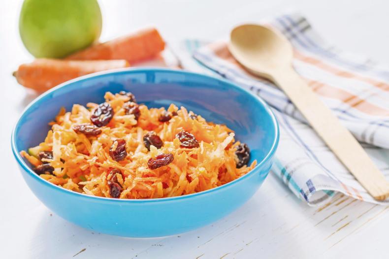 1. Coarsely grate the carrots and put in a bowl or suitable container with the raisins.