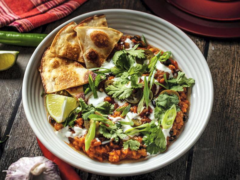 The black bean chilli is delicious with some shredded chicken or with a grilled piece of fish. Indeed, it is ideal with almost any leftovers in the fridge and keeps well. If you soak the lentils overnight then it will cook quicker.
