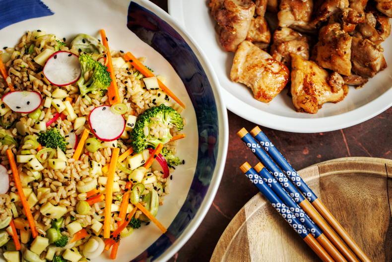 6. To assemble, divide rice between bowls. Then arrange the chicken, edamame beans, broccoli, mango, radishes, carrots and spring onions on top. Scatter over the sesame seeds and drizzle over satay sauce.