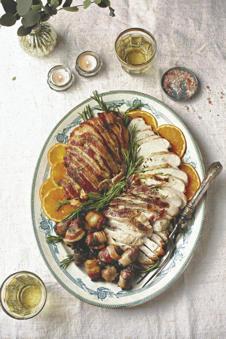 (375°F/gas mark 5).3 Cream the butter until soft, then beat in the garlic, lemon rind and herbs. Remove the crown from the brine and drain off any excess liquid, then pat the skin dry with kitchen paper. 4 Gently loosen the neck flap away from the breast and pack the flavoured butter right under the skin (this is best done using gloves). Rub the butter into the flesh, then re-cover with the skin and secure with a small skewer or sew with fine twine. 5 Cover the top of the turkey crown with the rashers.6 Put the prepared turkey crown in the oven and calculate your cooking time: 20 minutes per 450g (1lb) plus 20 minutes. This will cook much quicker than a whole turkey, so make sure to baste it often. You can cover it with foil if it’s browning too quickly. 7 When cooked, cover with foil to rest and keep warm. Drain away the cooking juices to make the gravy.8 To serve, carve the turkey crown into slices and arrange on warmed plates with a selection of your favourite accompaniments.Honey-glazed ham with cloves