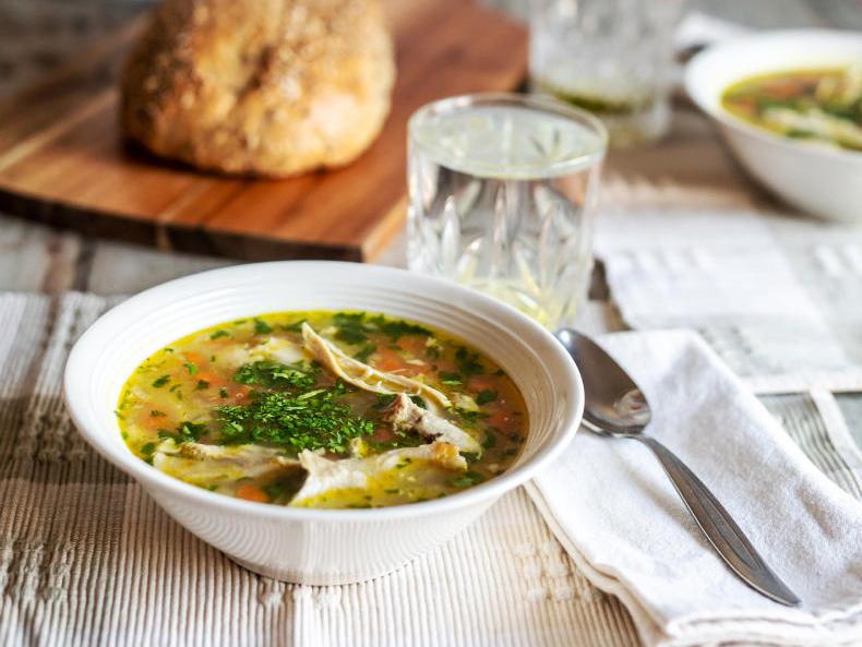 Poached chicken and orzo soup. \ Photography: Claire Nash. Food styling: Janine Kennedy