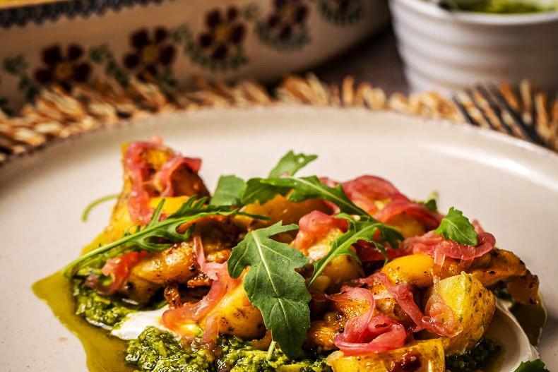 4. When ready to serve, stir the yoghurt until smooth, then spread over the bases of the plates and swirl in some of the pesto. Top with the roast potatoes and chicken. Then drizzle over the rest of the pesto and scatter over the pickled red onions. Finish each plate with some rocket to serve.
