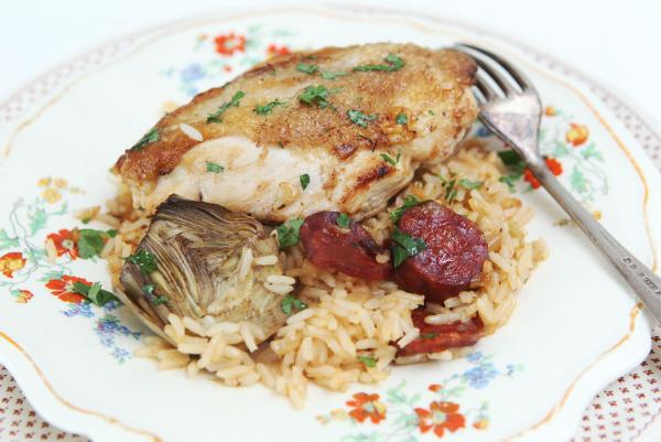 This chicken and chorizo rice bake is one of those great dishes you can just pop into the oven. It’s heartwarming and full of flavour. If you don’t have a suitable casserole dish, just use a large sauté pan, then transfer the contents to a roasting tin and cover loosely with tinfoil. I recommend buying a jar of artichokes, because the fresh ones are very tricky to prepare and the idea here is to have an easy, tasty meal. Or you could substitute with courgettes, which works very well. This is a dish which can also work perfectly with pork chops instead of chicken.