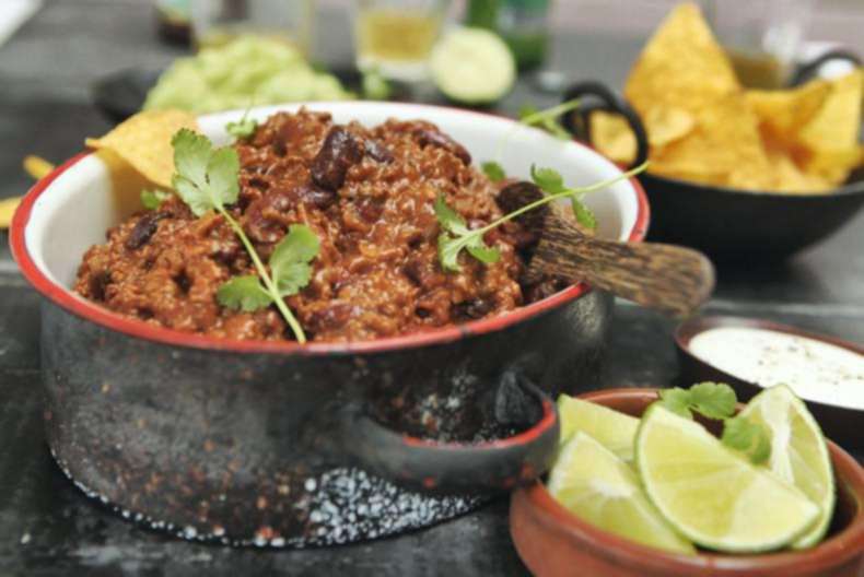 6. Transfer the chilli to a large serving dish and garnish with the coriander leaves and lime wedges. Serve hot with guacamole, tortilla chips and soured cream.