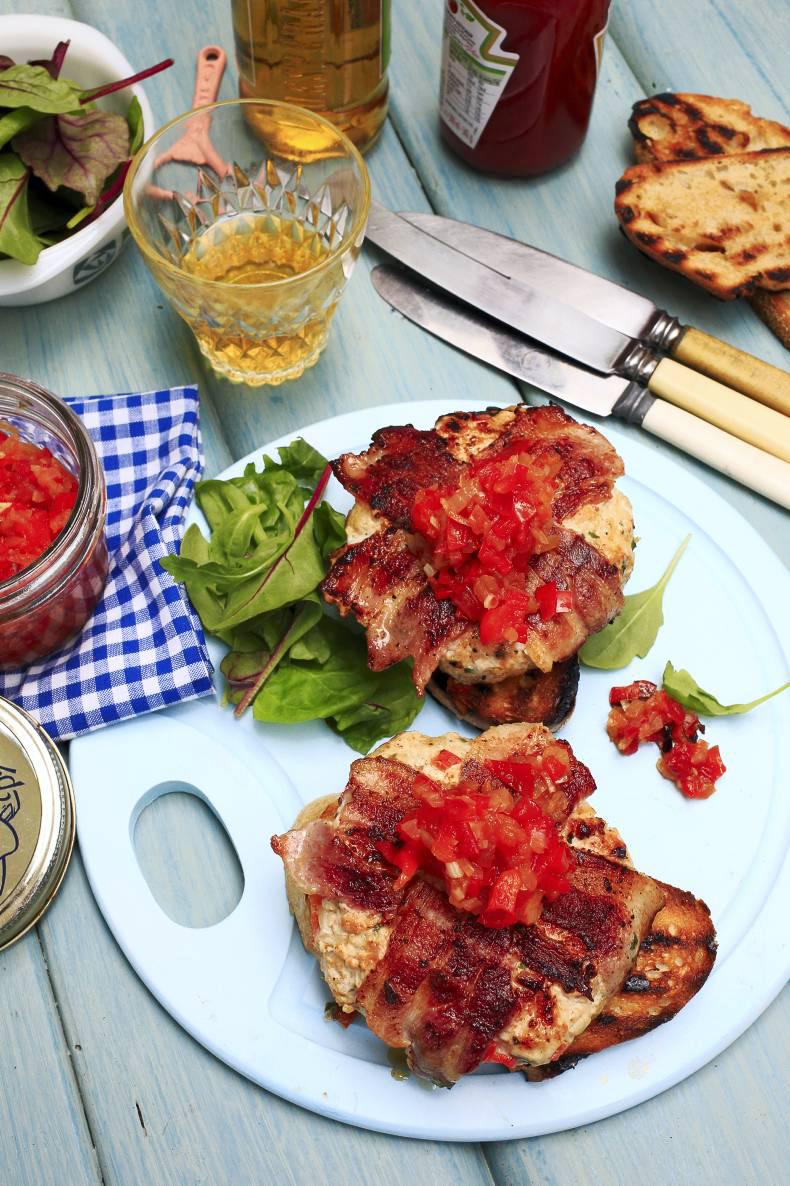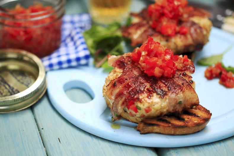Turkey and bacon burgers with sweet pepper and tomato relish