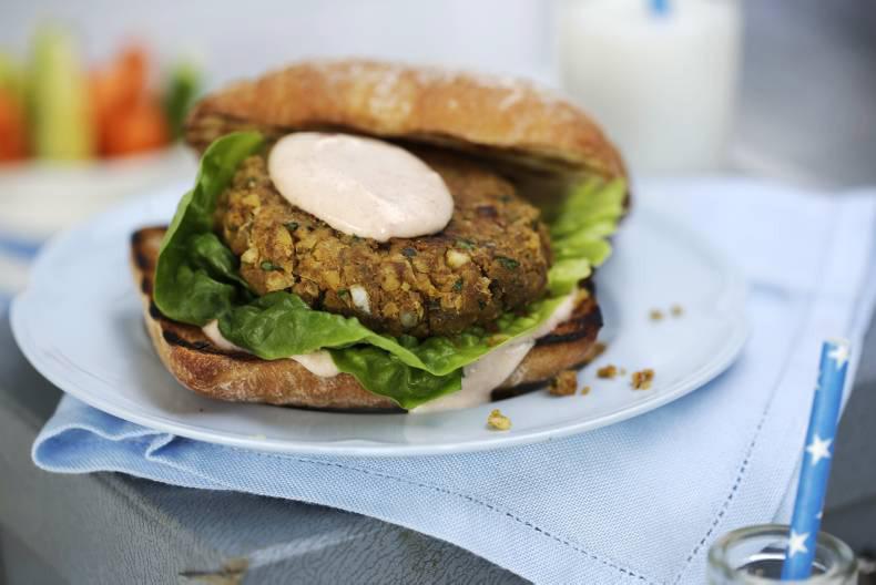 The falafel burger recipe has a Middle Eastern feel to it. Again, they have marvellous cuisine and I love adapting familiar recipes. Chickpeas are handy to keep in your cupboard. They are so versatile and you can make your own hummus by blending them with a little roasted red pepper, garlic and some herbs.