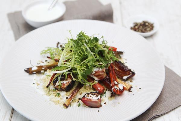 Roasted Root Vegetables with Buttermilk Dressing and Coriander Couscous