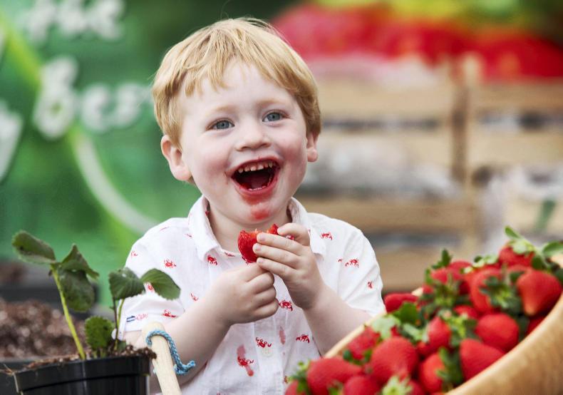 Leo Appleby (two) from Sandyford tastes some strawberries at the Keelings ‘Love to Grow Tunnel’ at Bloom 2017. \ Peter Houlihan