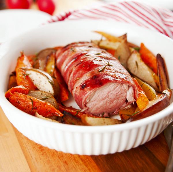 Preheat oven to 200°C/180°C fan.Combine the garlic and oil together.Place the sweet potatoes, carrots, onions and Keelings Irish pears in a bowl and toss them in the garlic oil mix. Season with some pepper.Arrange the vegetable and fruit mix in a single layer, in a roasting tin and roast for 20 minutes.While that is roasting, heat a teaspoon of rapeseed oil in a large heavy-based frying pan over medium-high heat. Sear the pork cutlets on each side for two to three minutes.Remove the roasting vegetables from the oven, sprinkle with sage and place the pork cutlets on top. Roast for 20 minutes until cooked. It’s ready to serve.Keelings Irish apple and pear flapjacks