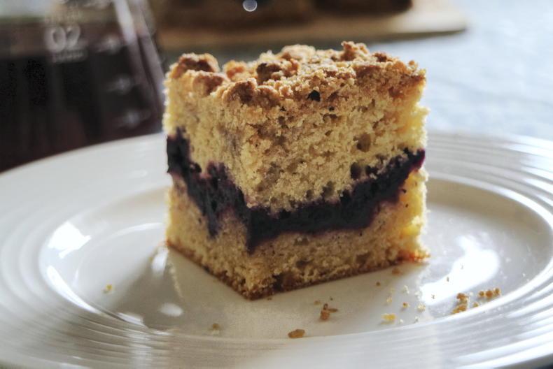 Blueberry buckle is a great breakfast cake. It only uses a small amount of sugar and butter - it's fruit-forward and not too sweet. I like having a slice with some yoghurt and coffee. Instead of being folded into the batter, the blueberries are added in their own layer, in between two layers of batter. The result is super tasty, but also very visually pleasing.