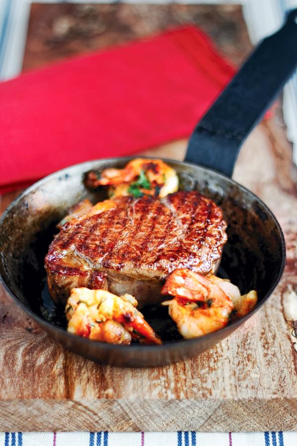 Serve the steak with the prawns, drizzle over the garlic butter and serve with red onion marmalade.* Steak cooking temperatures