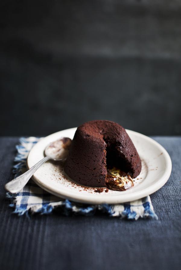 Preheat the oven to 190°C (170°C fan oven/gas mark five) and line a baking tray with baking parchment. Grease six dariole moulds (or small ramekins) with butter and coat with a little cocoa powder, tapping out any excess. Put the dariole moulds on to the prepared tray and set aside.Put the butter and chocolate in a heatproof bowl over a pan of simmering water, making sure the base of the bowl doesn’t touch the water. Stir occasionally until melted. Remove from the heat and leave to cool slightly.Put the eggs and sugar in a large bowl and, using an electric mixer, whisk for eight minutes or until pale and thick. While still mixing, pour in the chocolate mixture, mixing until fully combined. Sift over the flour and cocoa powder, then add the salt and fold together using a spatula until you have a smooth batter. Using a ladle, divide the batter among the prepared moulds and bake for eight minutes.Remove from the oven and use a blunt knife to loosen the edge of each mould. Immediately invert the fondants onto serving plates and serve with a little cream or ice-cream.The fondants can be prepared a day ahead and chilled until ready to bake. They can also be frozen and baked straight from the freezer – add five minutes to the baking time.Creme caramel