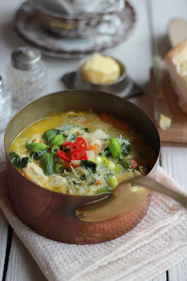 This chicken noodle soup is nutritious and tasty, while also being relatively plain in flavour and easy to digest. Once topped with chillies, scallions, basil leaves and an extra splash of soy sauce, it’s transformed into a flavoursome dish that my spice-loving boys adore.