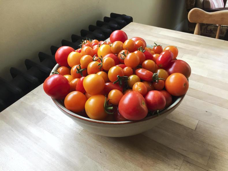 Tomatoes to fill the base of the tray, halved