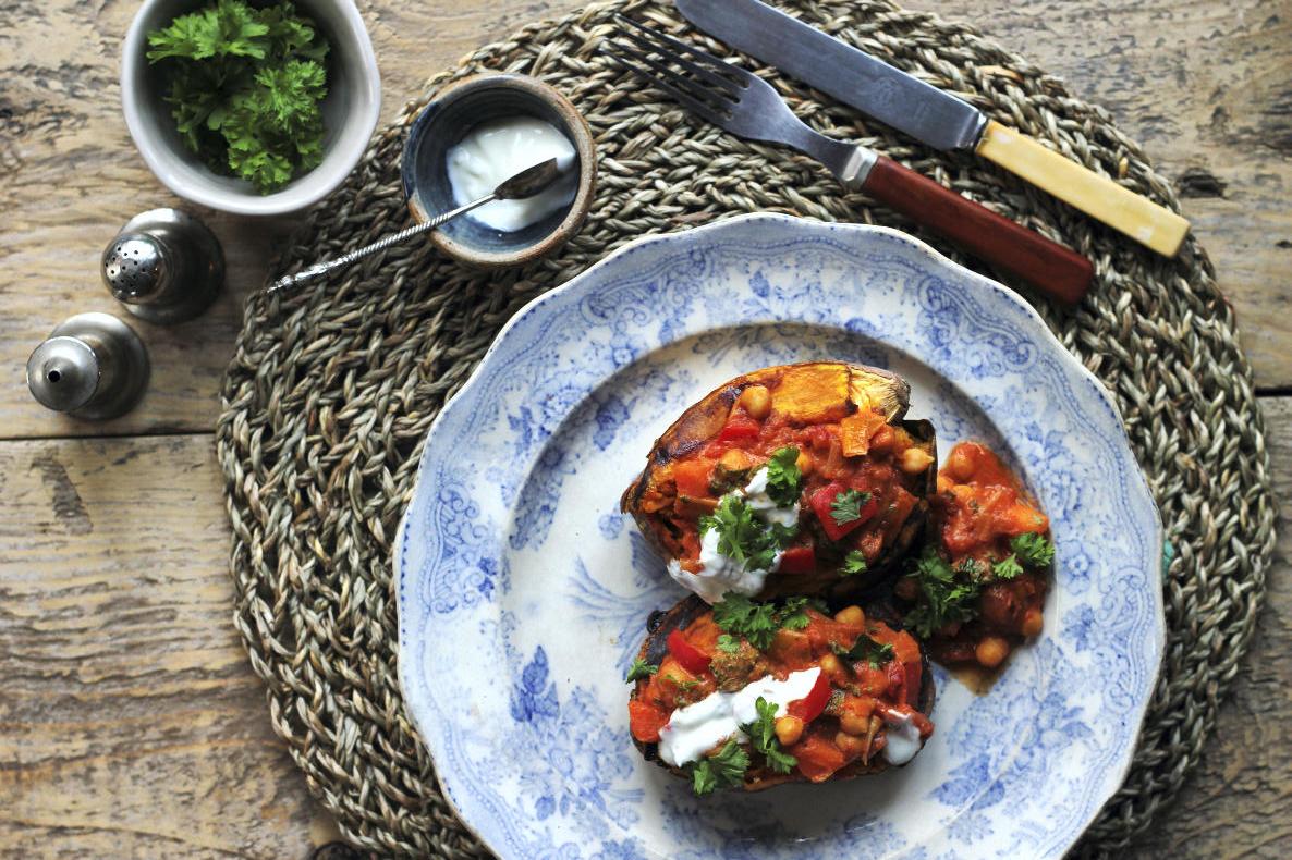 1 Preheat the oven to 220°C (fan 200°C/gas mark seven).2 Add 1 tbsp of the olive oil to a large saucepan and place over a low heat. Add the onion and leek and sauté for 10 minutes, stirring regularly.3 Add the celery, red pepper and carrots. Season with a little salt and pepper. Stir to combine and sauté for a further three minutes.4 Stir through the curry paste and add the tomatoes and sugar. 5 Bring to a simmer over a low heat for 30 minutes, but regularly stir to avoid the mixture sticking to the bottom of the pan. 6 To prepare the sweet potatoes, scrub them well and cut them in half, diagonally. Drizzle the cut side with a little olive oil and place, cut side down, on a baking tray. Place in the hot oven for 35-40 minutes, depending on the size of the potatoes. When cooked, they will be caramelised on the edges and if you were to squeeze them, cautiously, they have a little give. 7 To the saucepan, add the chickpeas and kale. Stir to combine and simmer for an additional 10 minutes. 8 Before serving, stir through 150g of the natural yoghurt. 9 Once cooked through, take the sweet potatoes from the oven. Place two halves on each plate and top generously with the spiced tomato mixture. Sprinkle over some of the chopped parsley and add a dollop of natural yoghurt. Read more