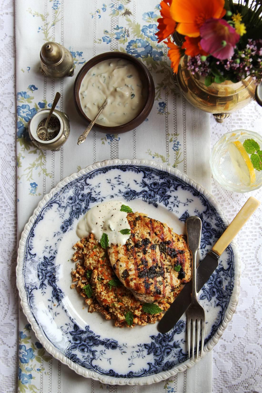 It’s important to use fresh herbs as the dried alternatives have a greater ability to cause heartburn. There is plenty of flavour in the stock-infused bulgur wheat, so really there is no need for a dressing, but my honeyed mint yogurt sauce coats the dish with a little luxurious creaminess that perfectly marries the flavours.