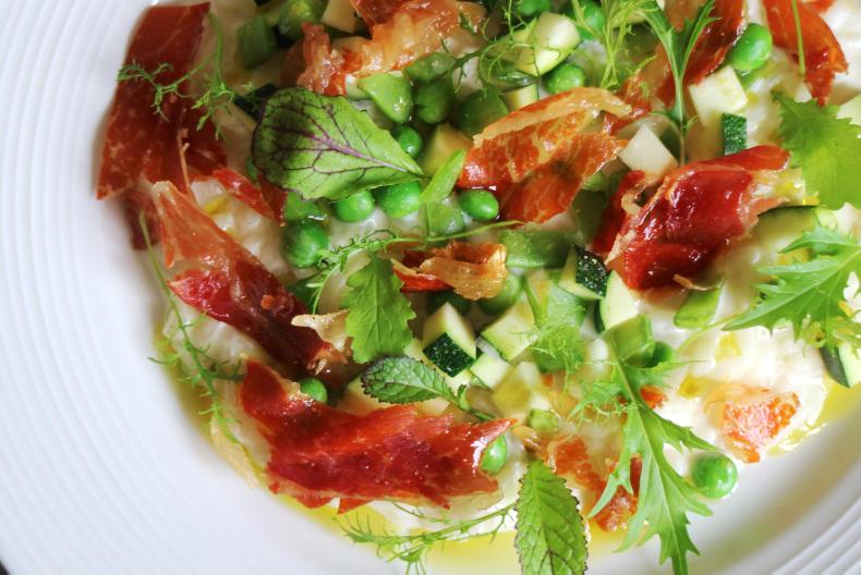 6. Warm dinner plates for serving. Scoop some risotto on to the plate and let it spread out a bit. Then, top with lightly warmed green vegetables, crumbled crispy prosciutto, a drizzle of olive oil and fresh garden greens. Serve immediately.