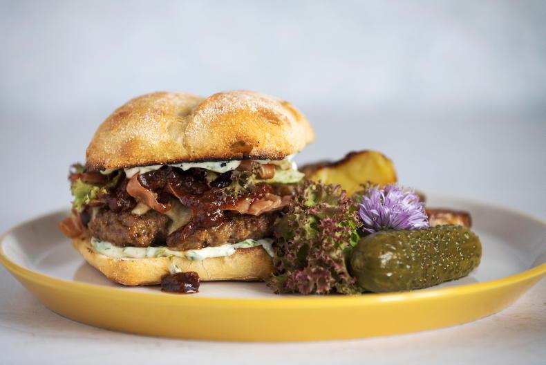 Smoked bacon beef burgers with cheddar shavings and tarragon mayonnaise