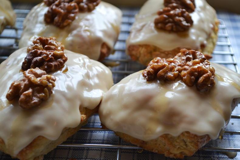 12. Dunk the tops of each scone in the glaze, or spoon the glaze over each scone allowing the excess to drip down the sides. Top with toasted maple-soaked walnuts. Allow glaze to set slightly before eating (if you can wait that long).