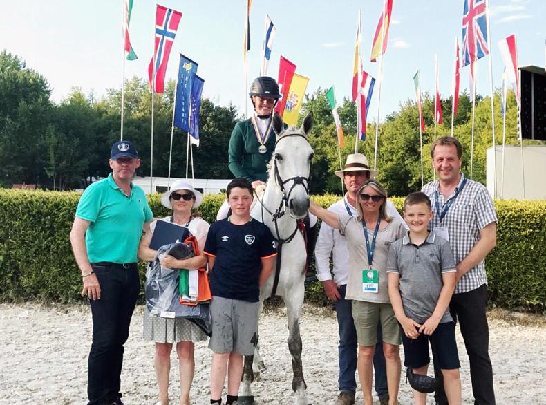 A Happy day at the 2017 European Championships in Hungry (l-r) Dennis Flannery (trainer) Anne Derwin, Francis Derwin jr., Kate Derwin on Cul Ban Mistress after winning a silver medal, Carol Gee, Conor Swindell and Clive Swindell (owner)