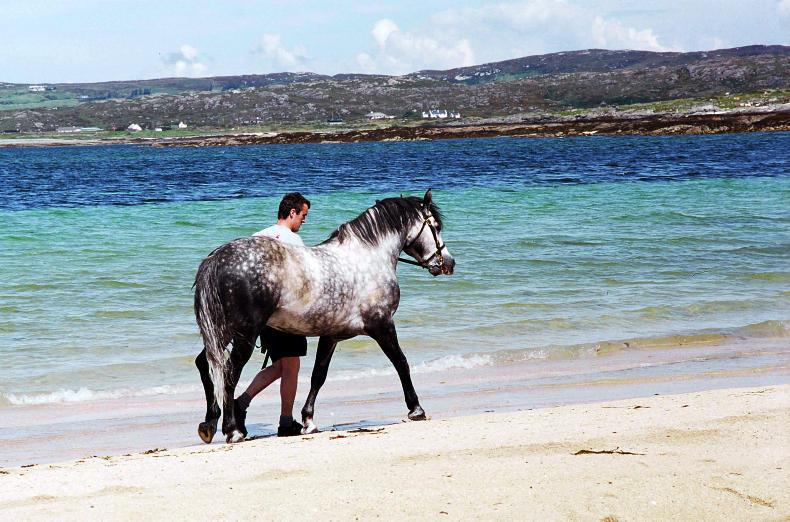 The highly successful stallion Silver Shadow and sire of Cul Ban Mistress taking a walk with Kevin Bolger on Ballyconneely strand in 2006 (Credit: Ruth Rogers)