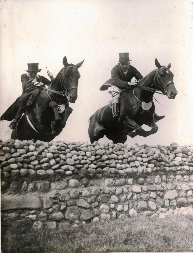 Major Carr on Snappy Bit and Doreen Lambert on Taltino jump the RDS Stone Wall for the Galway Blazers at the 1927 Dublin Horse Show. \ Royal Dublin Society