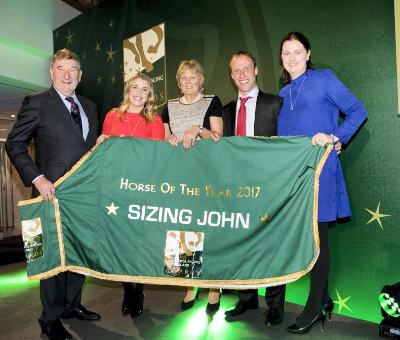 Pictured at the 2017 Horse Racing Ireland Awards is Chairman of HRI, Joe Keeling with Kate Harrington, Jessica Harrington, Jockey Robbie Power and Emma Galway accepting horse of the year award for Sizing John. \ healyracing.ie